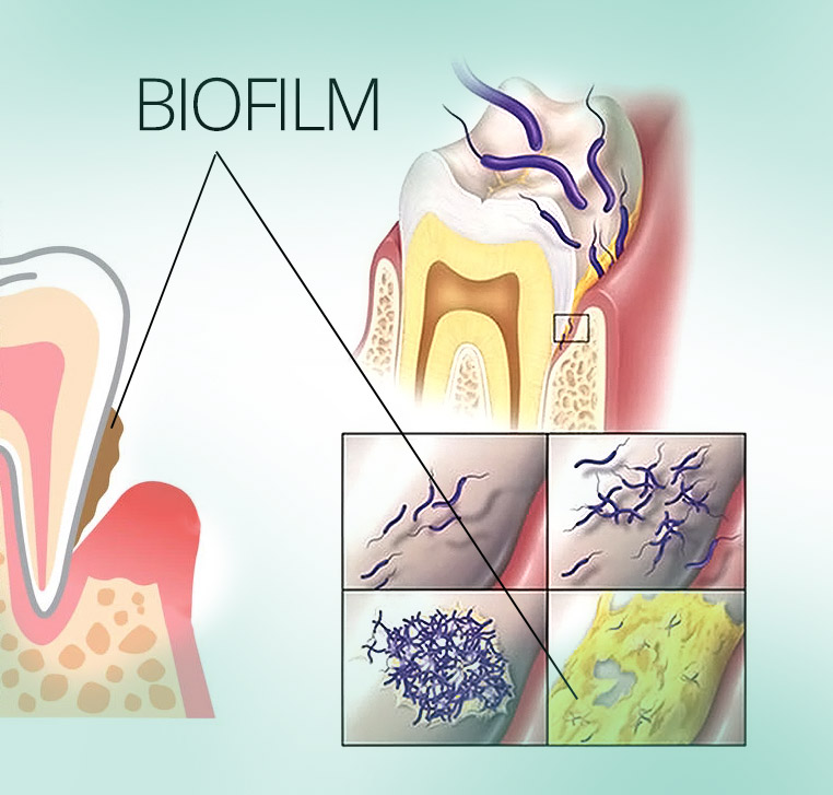 A fogakon, fogtöméseken, fogpótlásokon és implantátumok felszínén megtapadó vékony, láthatatlan baktériumokat biofilmnek nevezzük. A biofilm baktérium összetétele felelős a fogszuvasodás, fogágybetegség és implantátum körüli gyulladások kialakulásáért. A biofilm a nyálból kioldódó ásványi anyagok hatására idővel elmeszesedik, így alakul ki a fogkő.