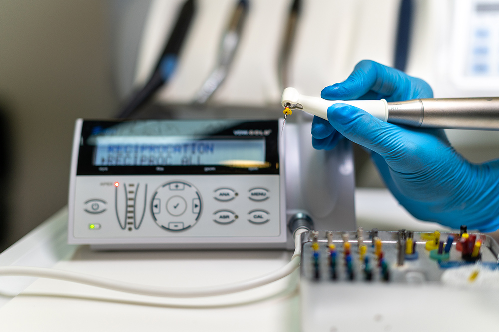 Egy kiváló eszköz a precíz munkához –endomotorral egybeépített apexlokátor a gyökérkezelések tartósságáért (VDW Gold Reciproc). A gyökérkezelés csak abban az esetben vezethet a várt eredményhez, vagyis a fog gyógyulásához, ha a gyökércsatorna megtisztítását megfelelő hosszban és megfelelő minőségben készítjük el. A gyökércsatorna hosszának meghatározásához nyújt segítséget az úgynevezett apexlokátor berendezés. Ez az eszköz lényegesen pontosabb képed ad kezelőorvosa számára a gyökércsatorna tényleges hosszáról, mint egy röntgen felvétel. Az endomotorral történő gépi megmunkálás sokkal tisztább,egyenletesebb gyökércsatornát eredményez. Az endomotor és az apexlokátor segítségével elkészült gyökértömések éppen ezért pontosabbak és tartósabbak lesznek.